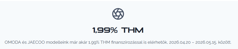 OMODA és JAECOO modelljeink már akár 1,99% THM finanszírozással is elérhetők, 2026.04.20 – 2026.05.15. között.
